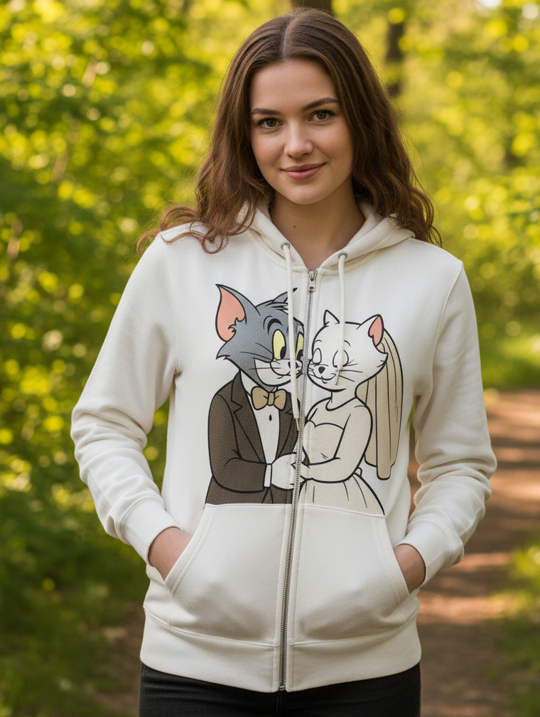 Prompt: A white zipper hoody having a design of tom marrying another lady cat