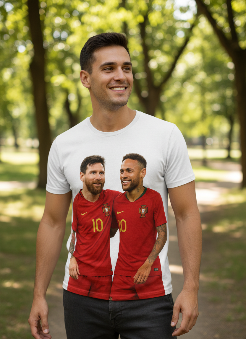 Prompt: A T-Shirt Design with Messi and Neymar wearing Portugal's kit.